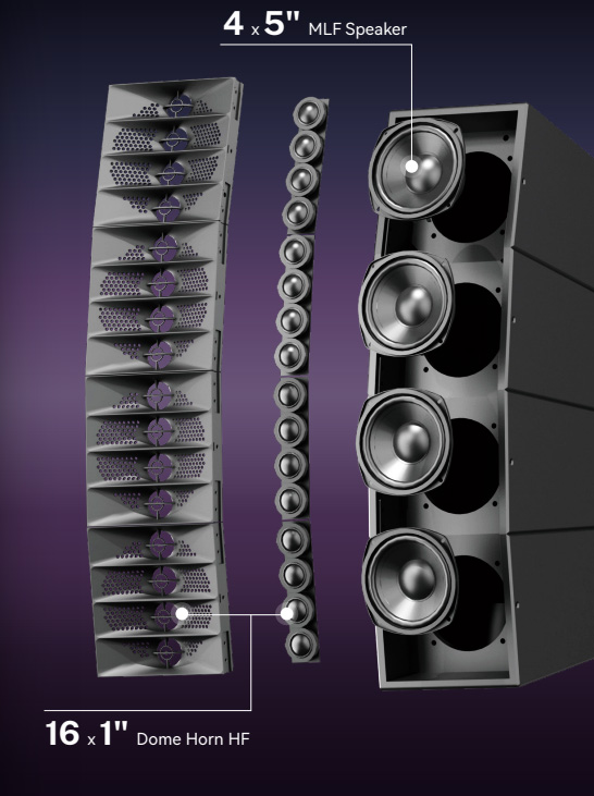 - Kết cấu loa 3 way: 4 loa mid 5” nam châm Neodymium + 16 loa treble dome 1” + Sub đôi 12-inch (2x12)