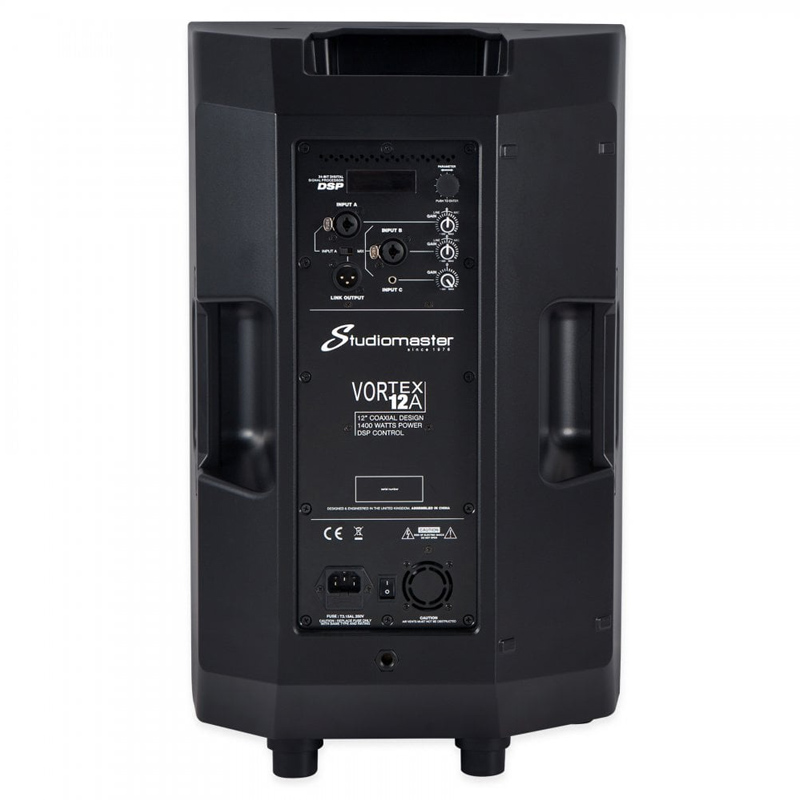 Thiết kế mặt sau loa Studiomaster Vortex 12A có sẵn 3 ngõ inputs micro và kết nối phát nhạc không dây qua Bluetooth được tích hợp, người dùng có thể sử dụng độc lập 1 loa để giải trí, ca hát hoặc sinh hoạt hội nhóm, club... cực kì hiệu quả và cơ động.